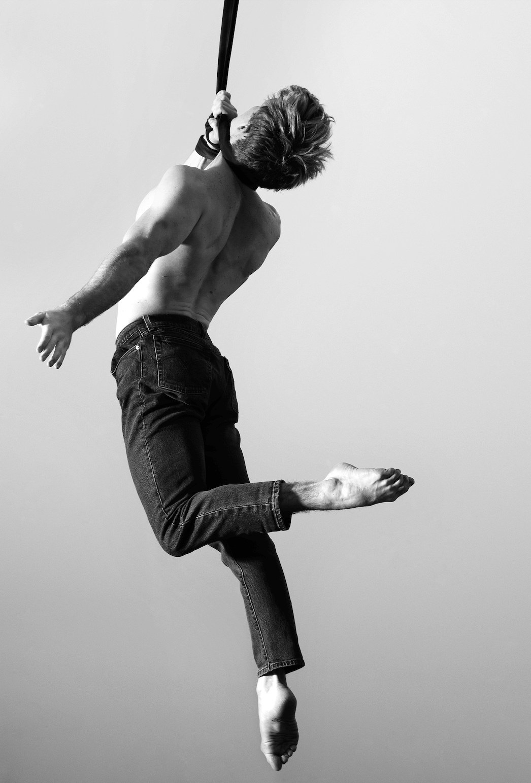 Quentin se sert des sangles aériennes et des contraintes physiques qu’elles imposent à son corps pour exprimer ses sentiments, ses émotions, dans un espace définiment infini : en apesanteur.