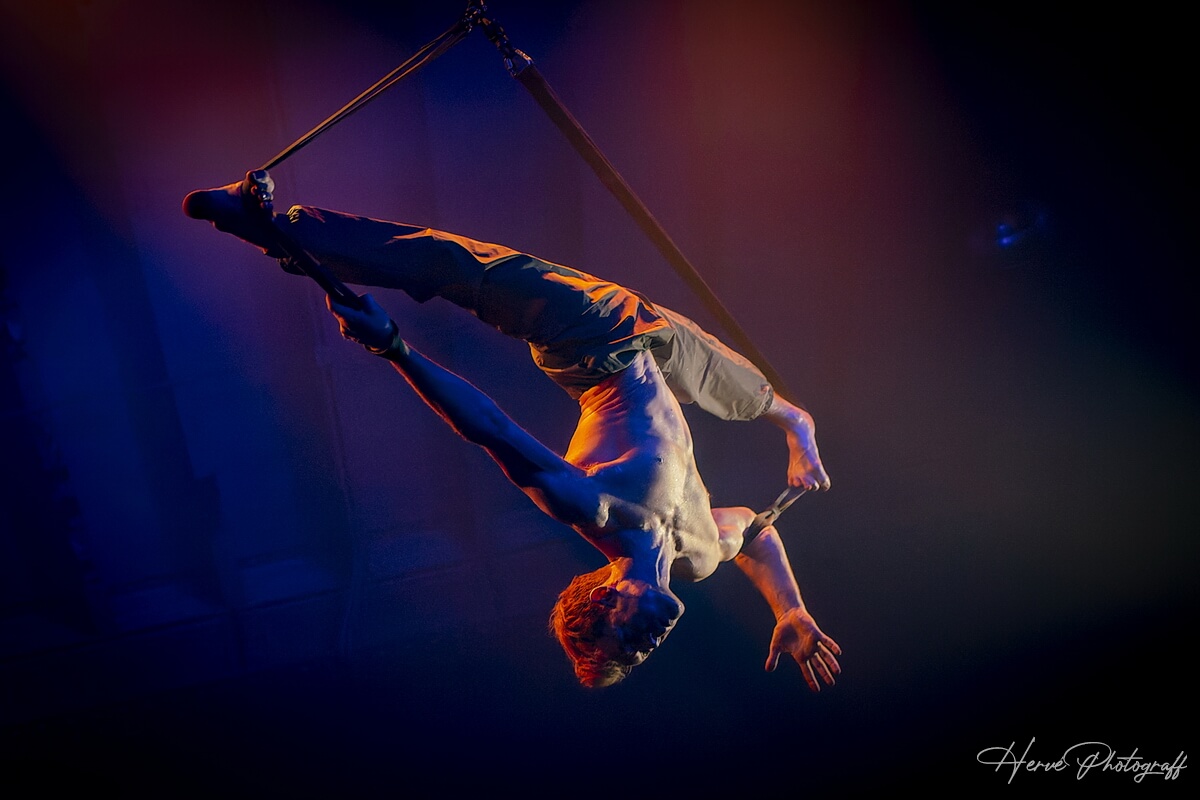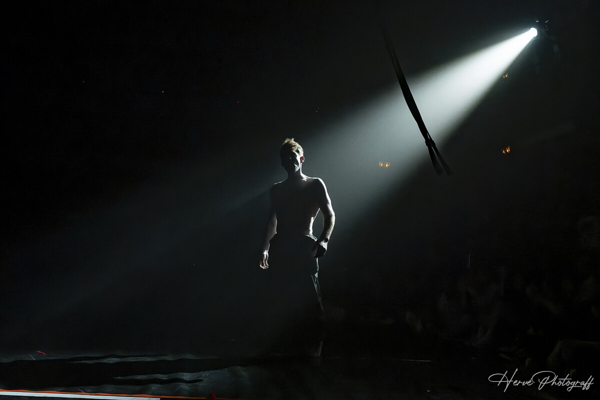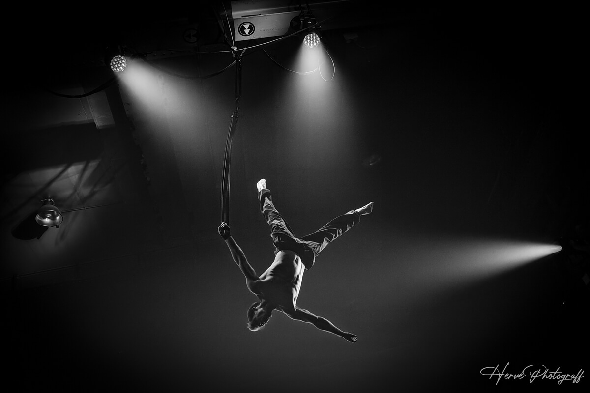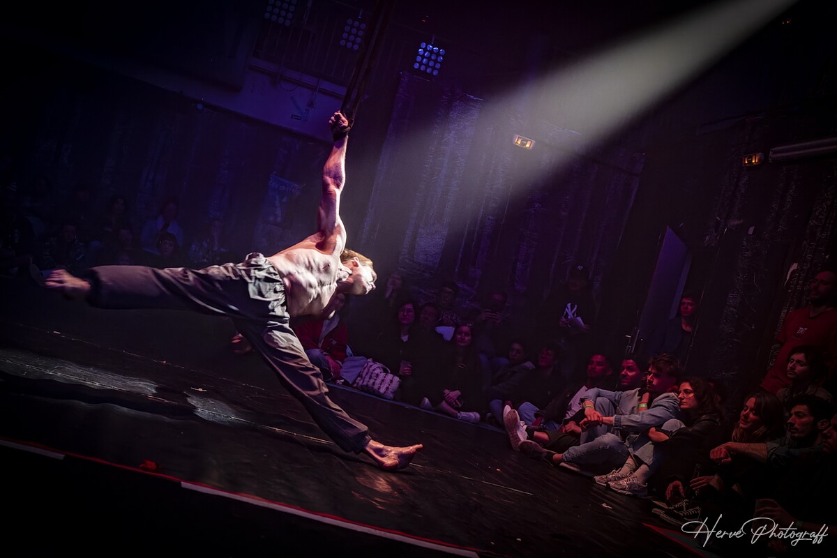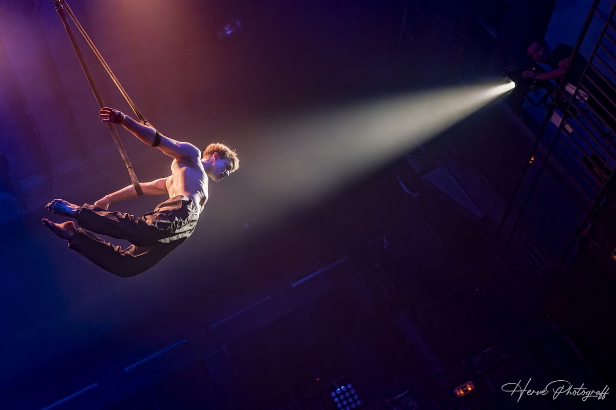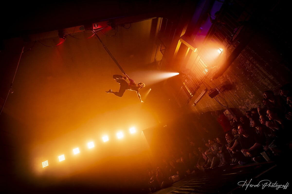 La seconde fois sur mes sangles aériennes, je suis apparu, bestiale, depuis le fond du lieu, jusqu’à passer au-dessus du public sur un pont aérien qui bougeait horizontalement et qui m’a amené au milieu de la scène. Un final de 5 minutes de sangles où j’ai pu exprimer toute ma singularité, comme pour montrer ma joyeuse rage et mon bonheur d’être ici avec ces magnifiques artistes.