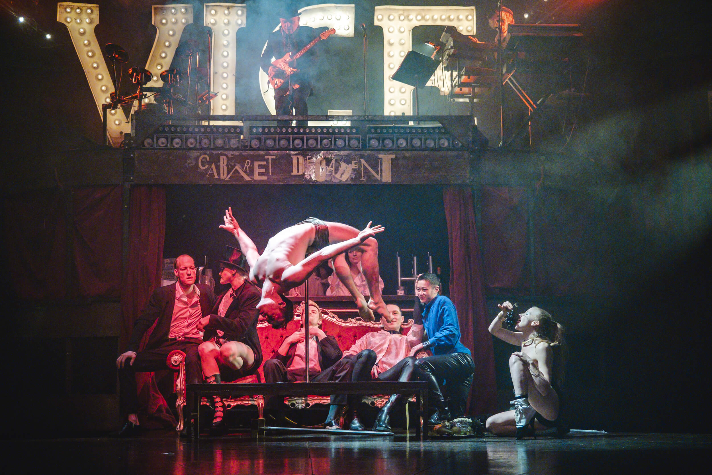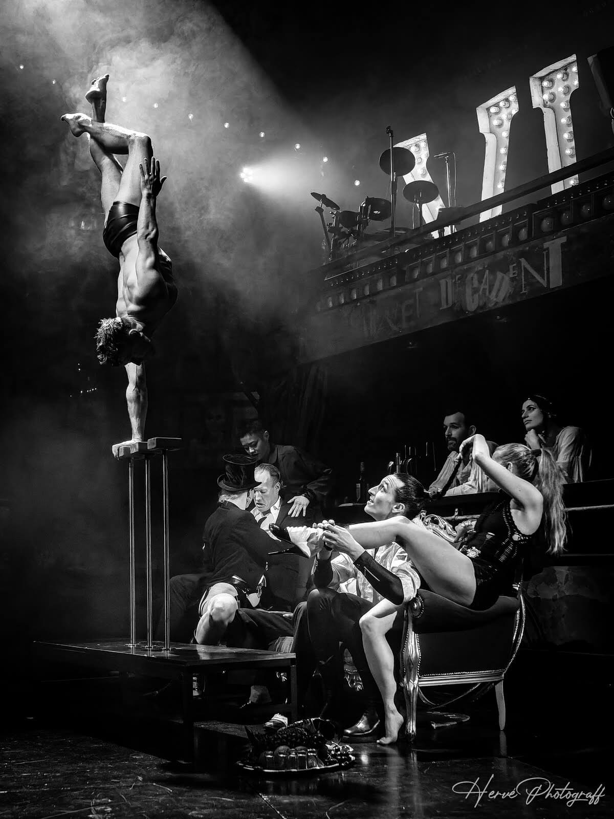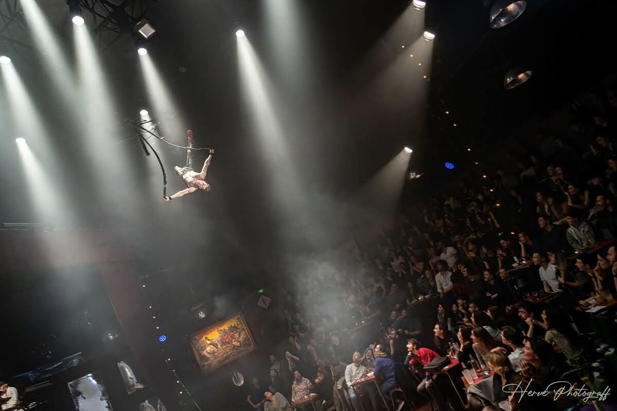 Sur ce cabaret, je fais trois apparations : en équilibre sur cannes, aux sangles aériennes avec Corinne sur sa musique « Oh mon Amour », et aussi sur sangles bungees. Dans les costumes de Jef Castaing. Nous avons joué le spectacle à 28 reprises, chaque soir, salle comble !